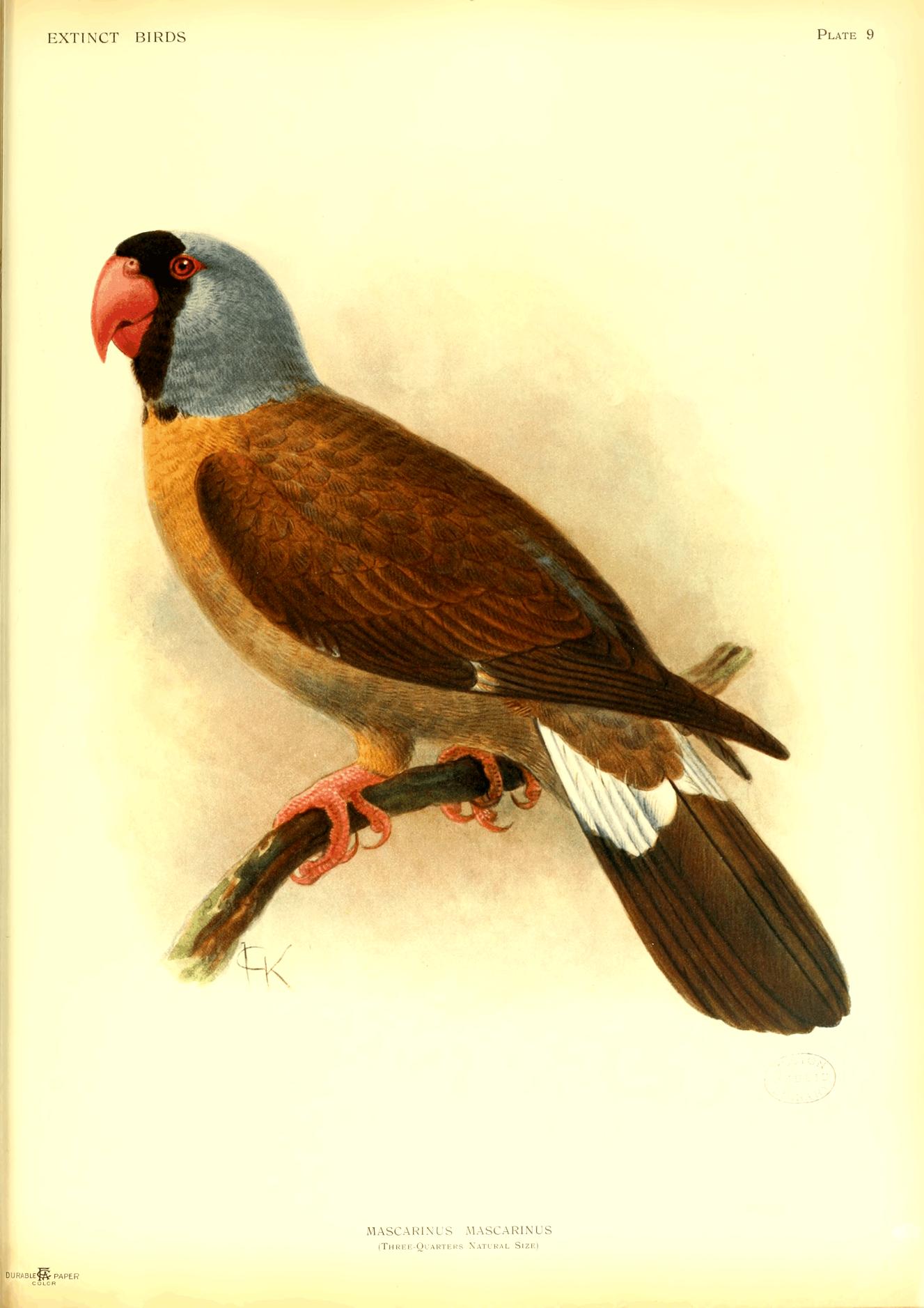 [1] "Psittacus brachyurus fuscus, facie nigra, cauda albente. Habitat in Mascarina. Rostrum incarnatum. Caput caerulescens."
