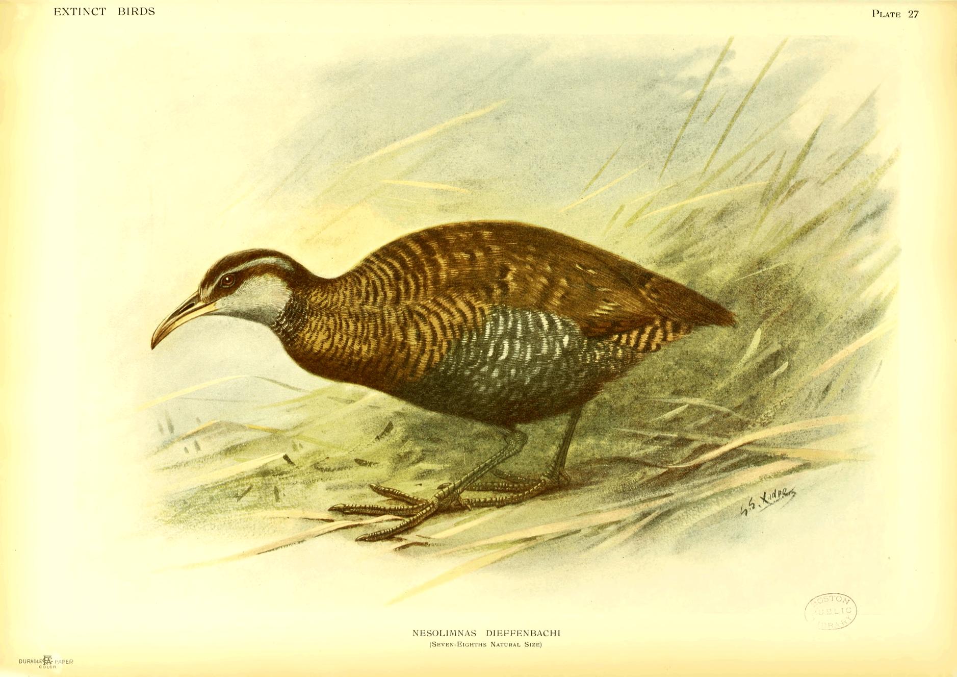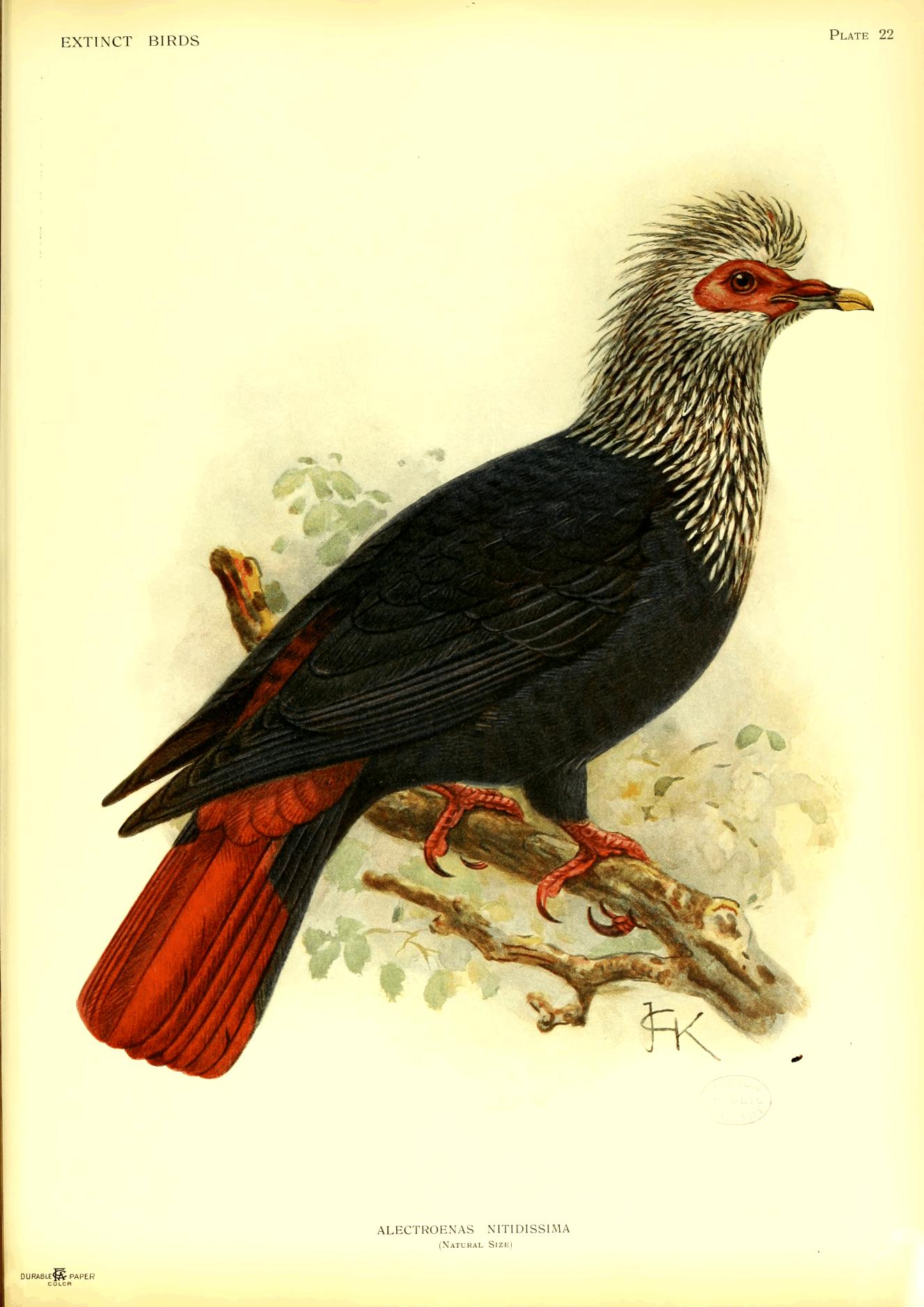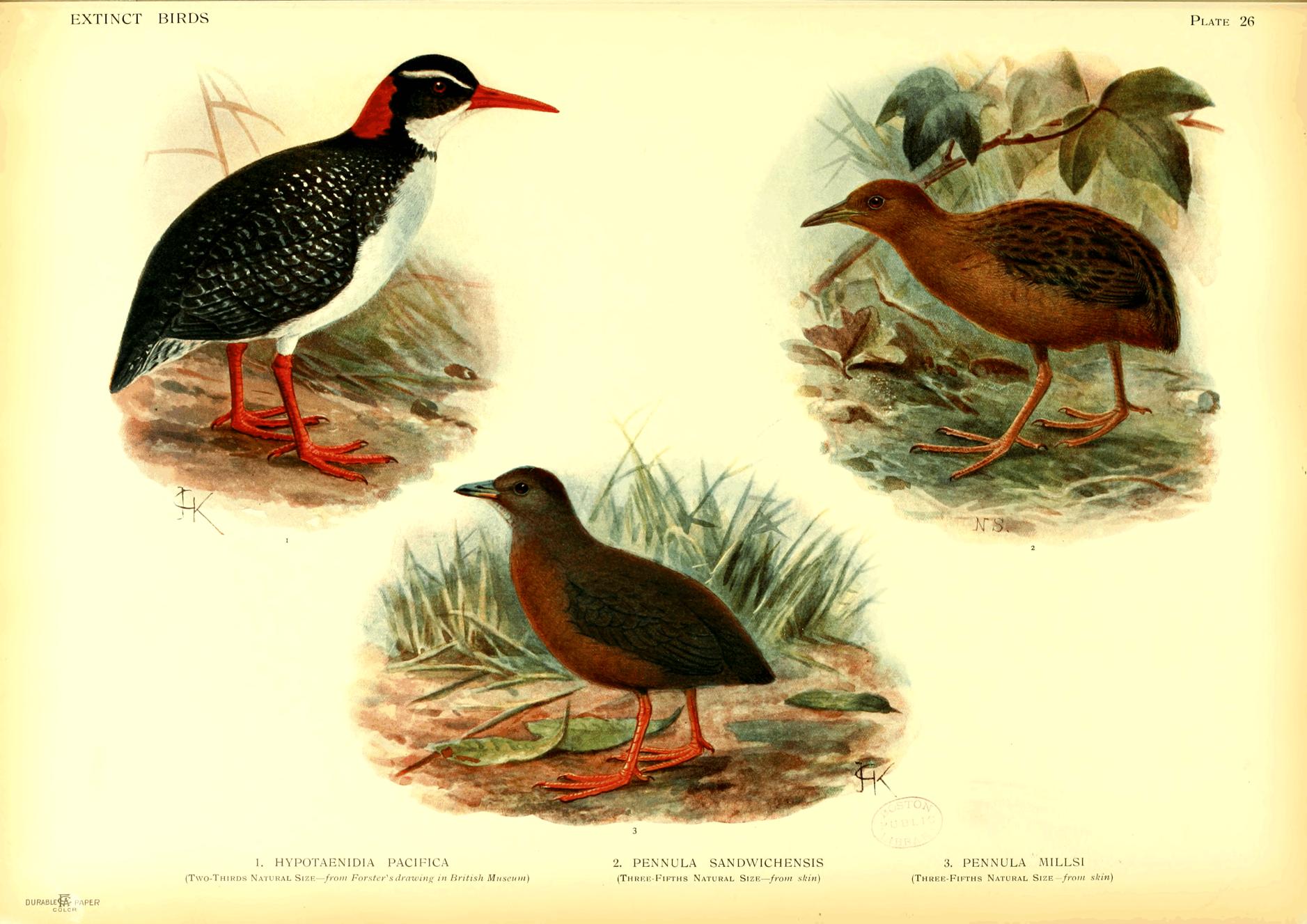 On the whole, this book is confined to species actually known to be extinct, but a few are included of which a small number is still known to exist, because firstly there seems no doubt that they will vanish soon, and secondly, as in the case of Notornis, it was necessary to clear up certain misconceptions and contradictory statements. In the case of a few species believed to be quite extinct, it is possible that some individuals may still exist in little known parts of their range, while on the other hand it is more than likely that several of the species referred to in my lecture (Proc. Orn. Congress pp. 191-207, 1907) as threatened with destruction, have already ceased to live. This may also be the case with some birds not alluded to at all.