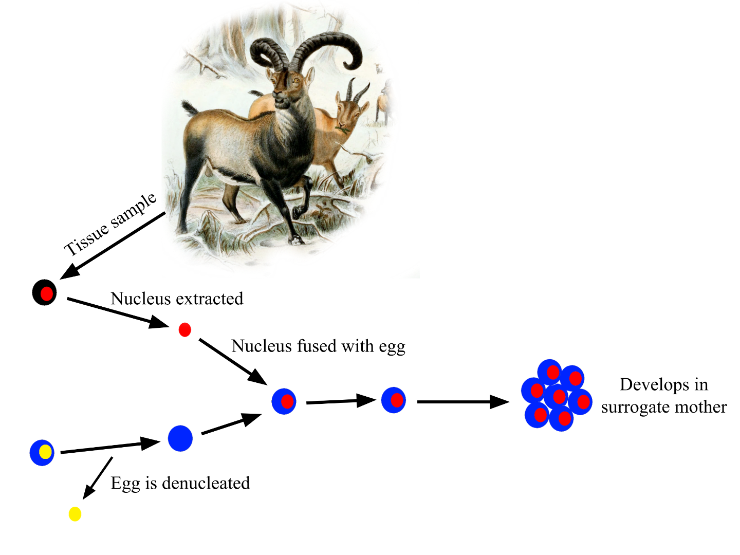 Pictured above is the process used to clone the Pyrenean ibex. The tissue culture was taken from the last living, female Pyrenean ibex named Celia. The egg was taken from a goat (Capra hircus) and the nucleus removed to ensure the offspring was purely Pyrenean ibex. The egg was implanted into a surrogate goat mother for development - wikimedia ![]()