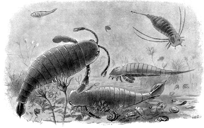 Articulate animals are a very ancient race, as well as a flourishing one, for the oldest rocks containing undoubted fossils—namely, certain slates found in Wales and the Lake District—tell us of a time when shallow seas swarmed with little articulate animals known as trilobites. They were in appearance something like [26] wood-lice of the present day; and the record of the rocks tells us plainly that creatures built upon this plan have flourished ever since. We mention this because they are related to the king-crabs of the present day, and therefore to the huge old-fashioned sea-scorpions we are now considering.